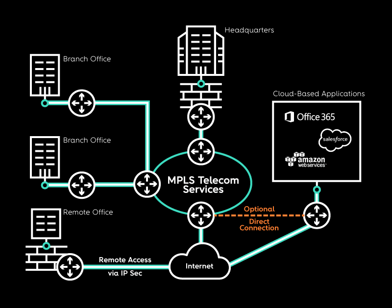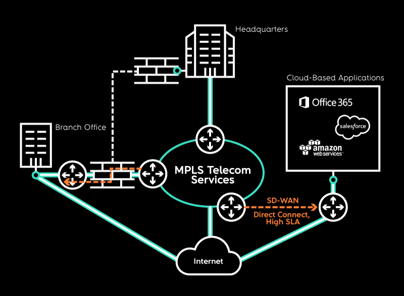 Today, basic enterprise IT architecture consists of IP/MPLS VPN services with hubs and branches connected to each other and then to the internet and cloud software services such as Microsoft 365 and Salesforce.com. Generally, traffic between branches and the Internet and Cloud are routed through a centralized hub. But with this rather constricted configuration, heavier loads demanding more bandwidth and hardware circuits increase expenditure, and traffic is slowed.